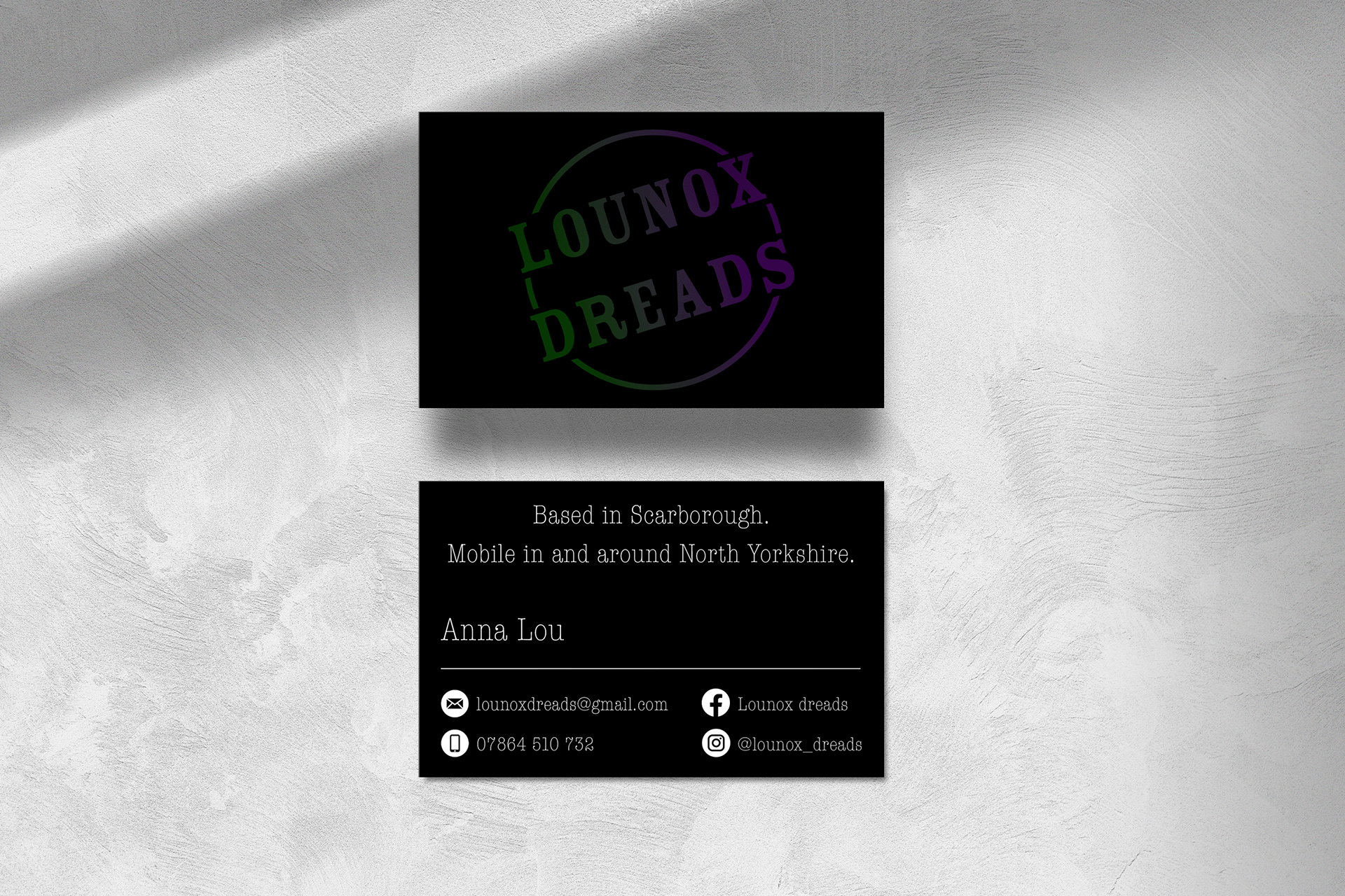 Business cards designed for a new loctician based in the Scarborough area. The green and purple logo pops against the pitch black background. On the other side of the business card, American Typewriter font was used to give it a classic look that really reflects the personality of the client. The cards were finished on 350gsm matte paper.